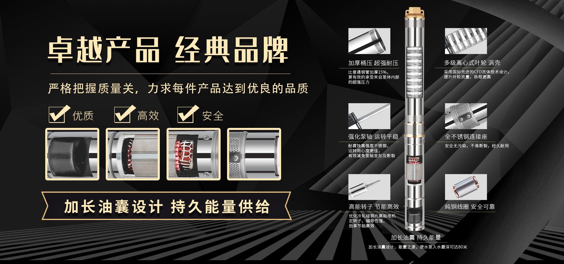 不僅僅是泵,更是流動(dòng)的科技。十多年來,本公司堅(jiān)持走:以質(zhì)量求生存以科技創(chuàng)新求發(fā)展,重合同守信用的道路,生產(chǎn)經(jīng)營(yíng)得到迅速發(fā)展。更希望以后不管從發(fā)達(dá)城市到新農(nóng)村,從工業(yè)制造到尖端科技產(chǎn)業(yè)都隨處可見創(chuàng)江井泵的身影,創(chuàng)江深井泵已成為干萬(wàn)用戶心目中優(yōu)質(zhì)和信心的保證我們將以優(yōu)質(zhì)的產(chǎn)品和最完善的售后服務(wù)來真誠(chéng)與各界朋友開展廣泛的合作,共同創(chuàng)造一個(gè)美好的未來!